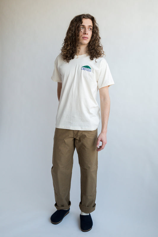 Vintage fits. Organic cotton tees, grown and sewn in TX. Sweatshirts made from organic recycled cotton.