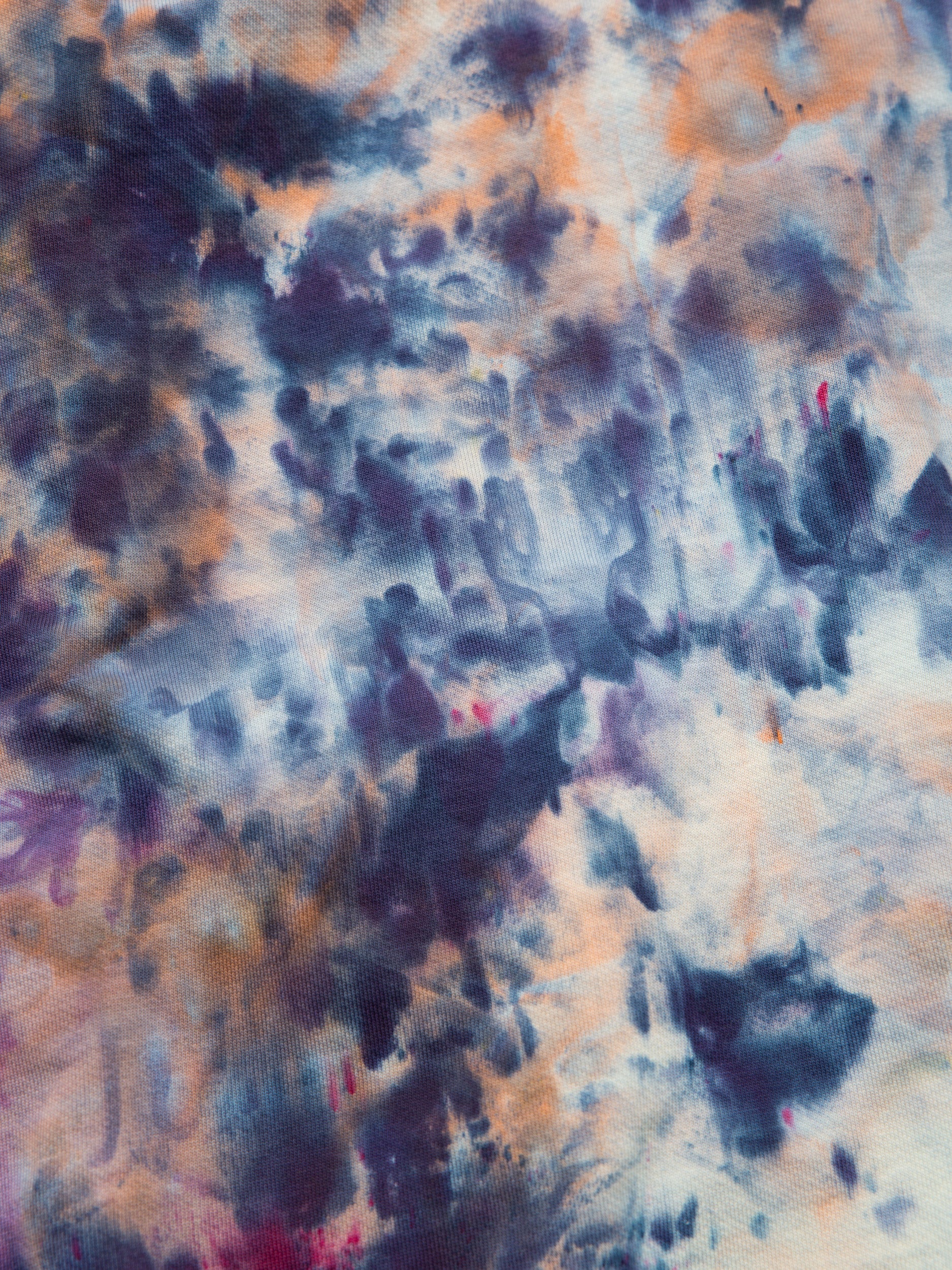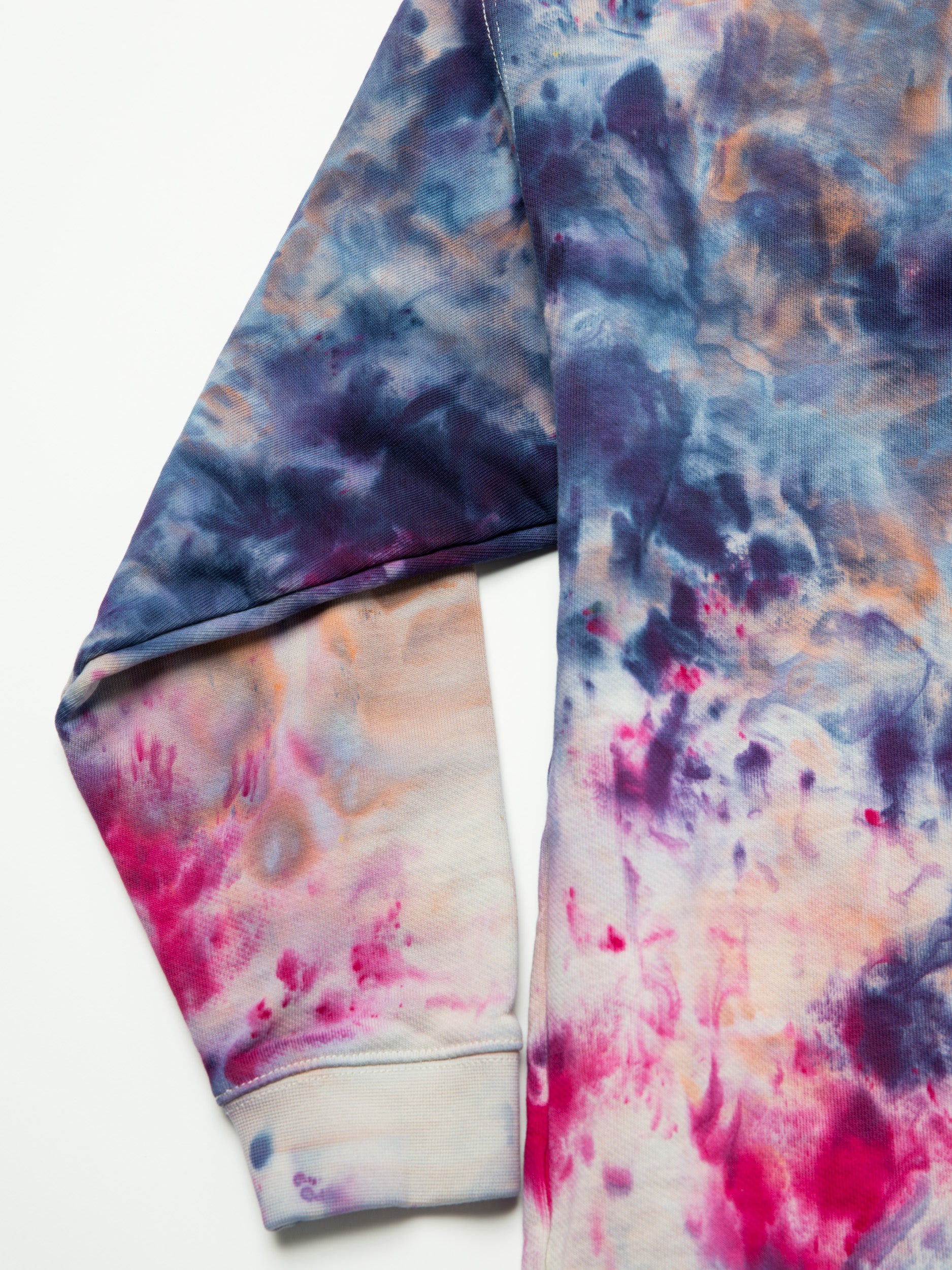 100% organic cotton french terry sweatshirt with a dry hand. Hand-dyed with low impact fiber reactive dye. Each sweatshirt is one-of-a-kind and will vary in pattern.