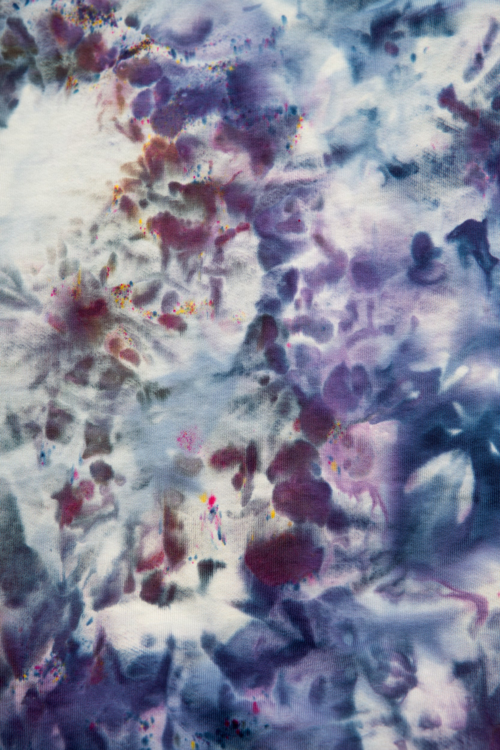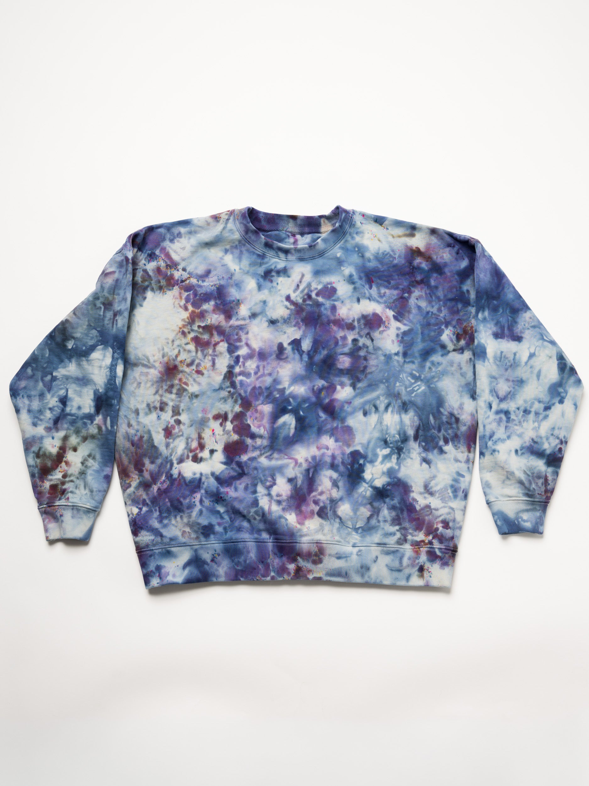 100% organic cotton french terry sweatshirt with a dry hand. Hand-dyed with low impact fiber reactive dye. Each sweatshirt is one-of-a-kind and will vary in pattern.
